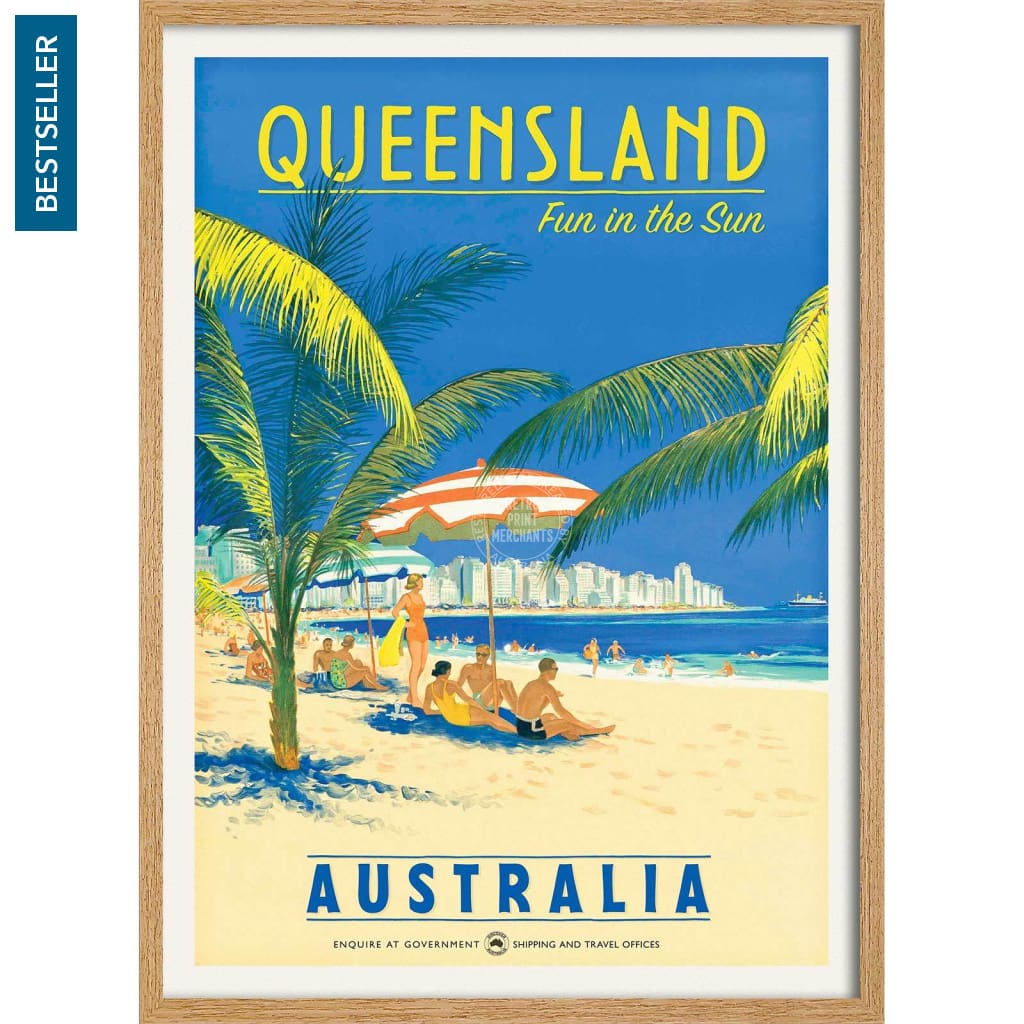A retro travel poster for Queensland and its iconic beach life, inspired by an original 1950s artwork.