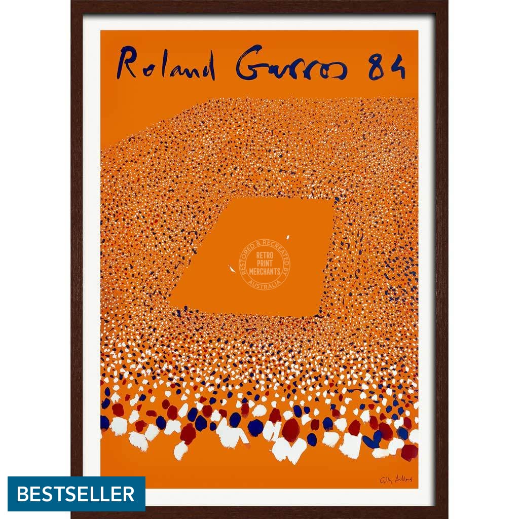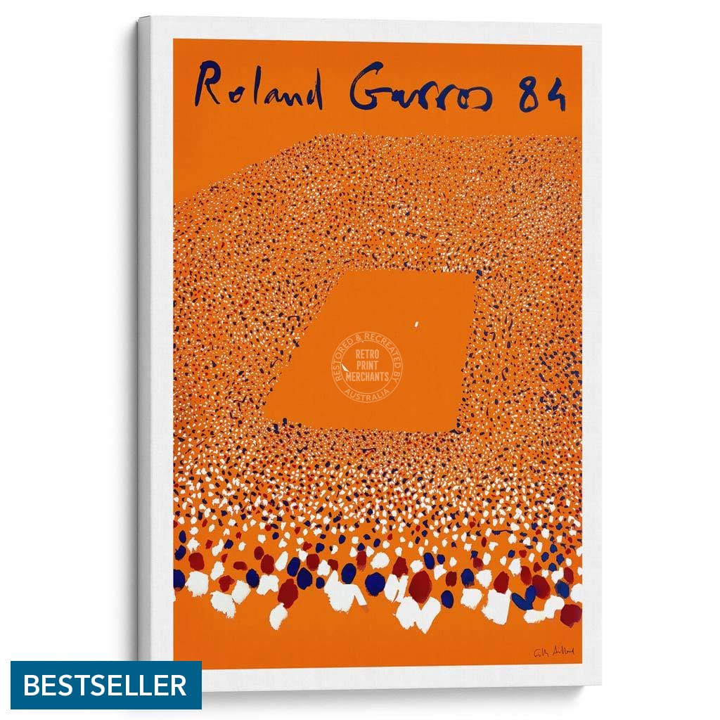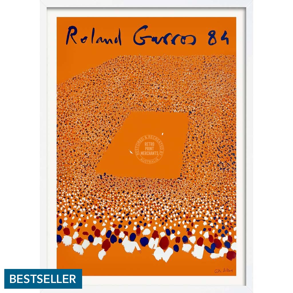 A vintage promotional poster for the French Open tennis tournament held over two weeks in late May every year at the Stade Roland Garros in Paris. This 1984 artwork for the Grand Slam event was designed by French painter Gilles Aillaud, the first artist to depict crowds at Roland Garros on the annual poster.
