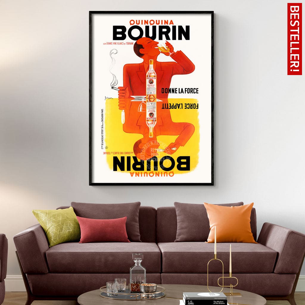This Bourin poster was produced in 1936 by French brothers Jacques and Pierre Bellenger. The clever design shows that Bourin Quinquina can be enjoyed as an aperitif, while dining and as a digestif.