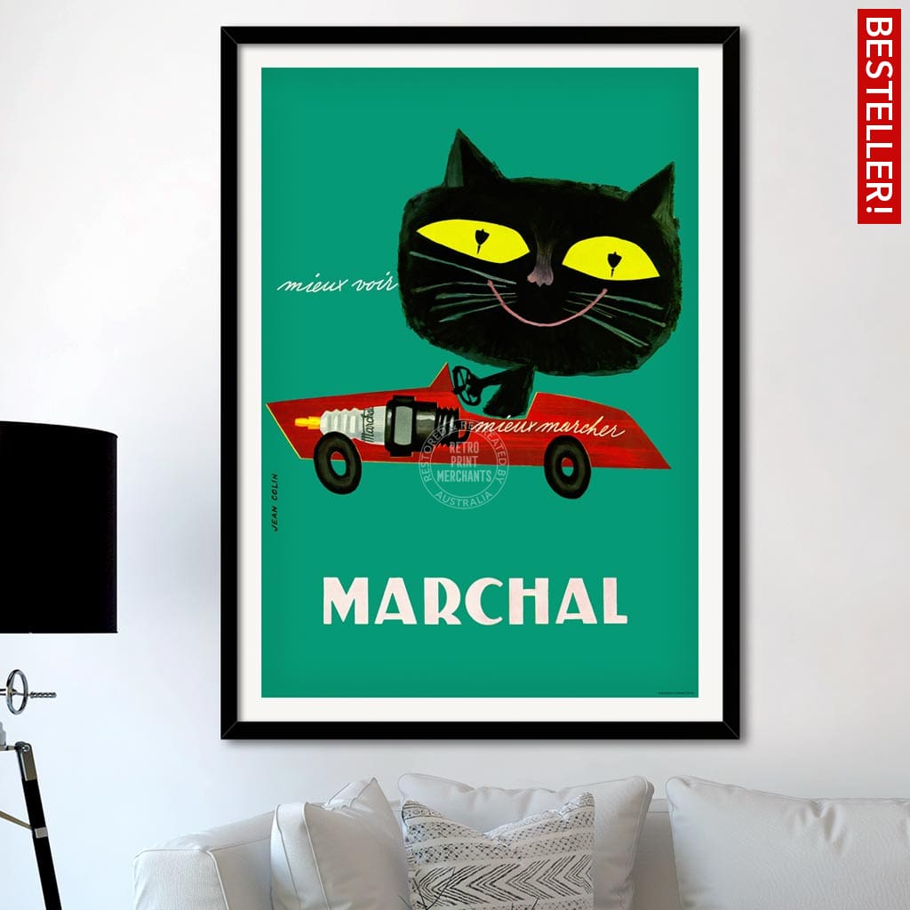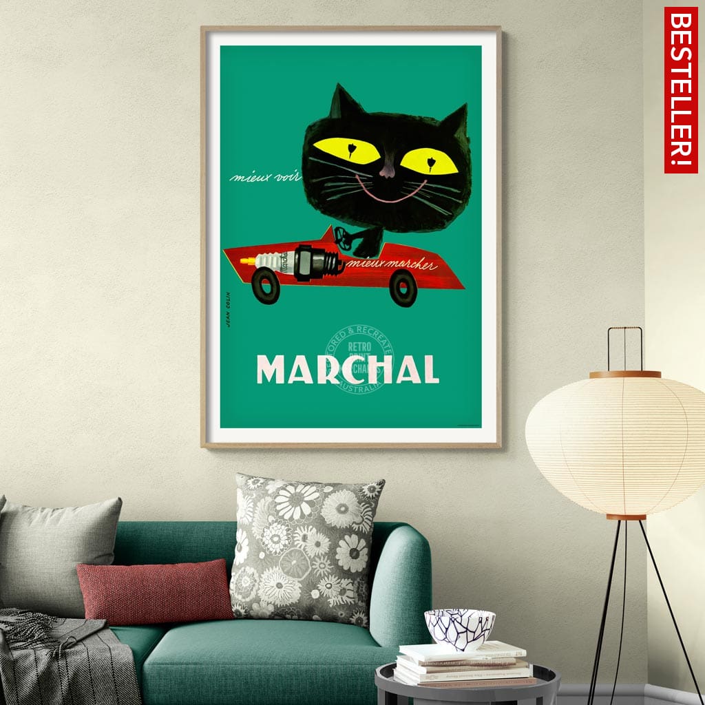 Restored poster print from the 1960s designed by poster artist Jean Colin for the French automotive parts maker Marchal.