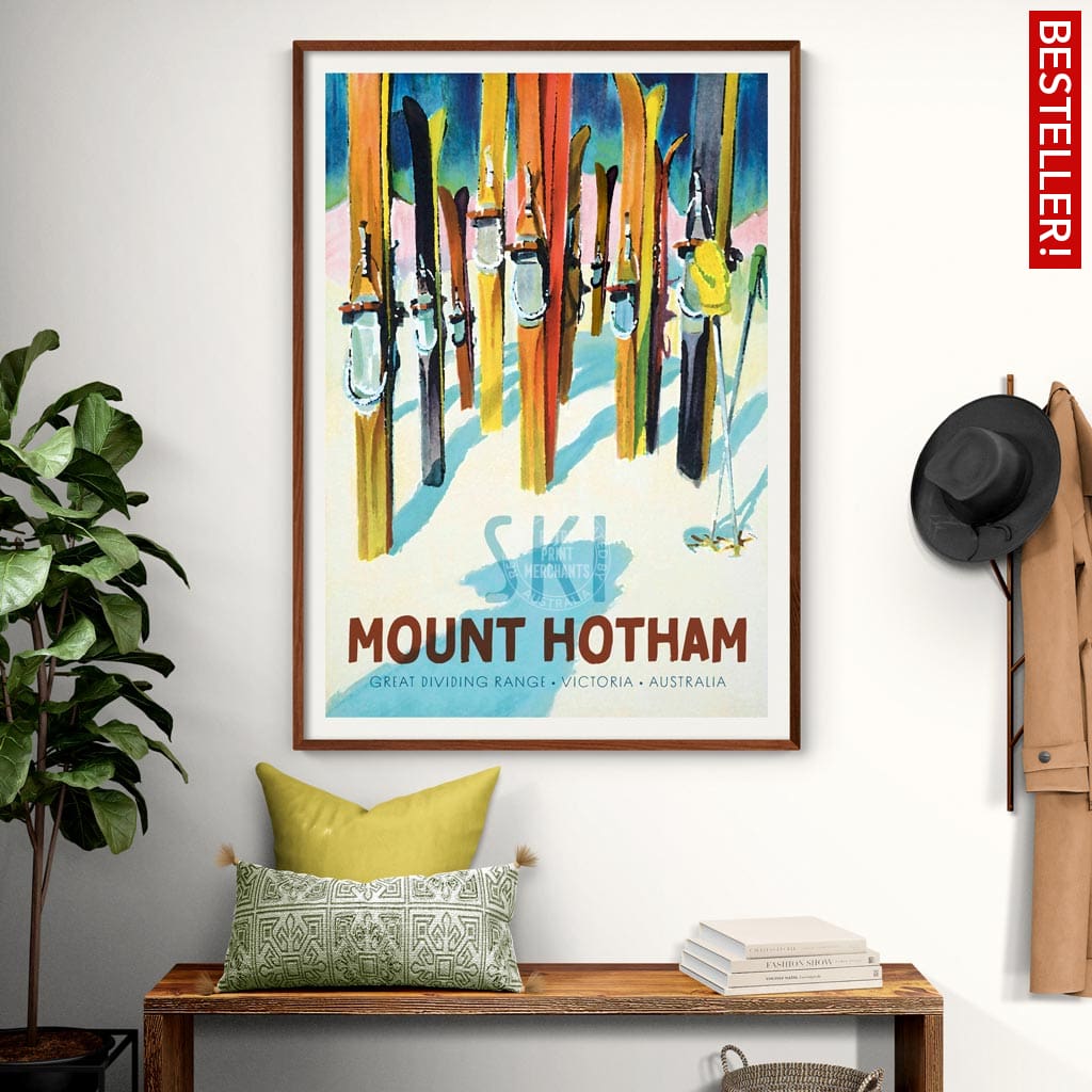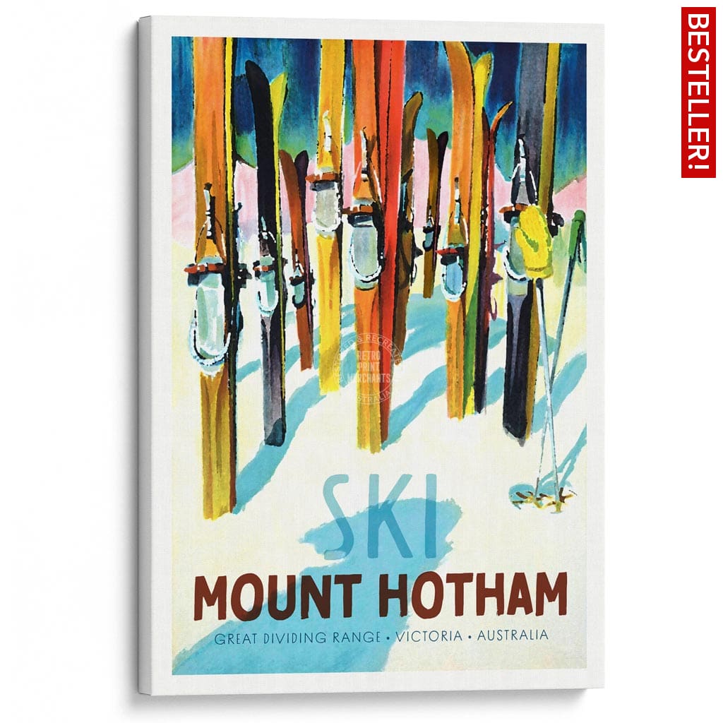 A retro ski poster for Mount Hotham in Victoria, Australia, inspired by an original 1940s artwork.