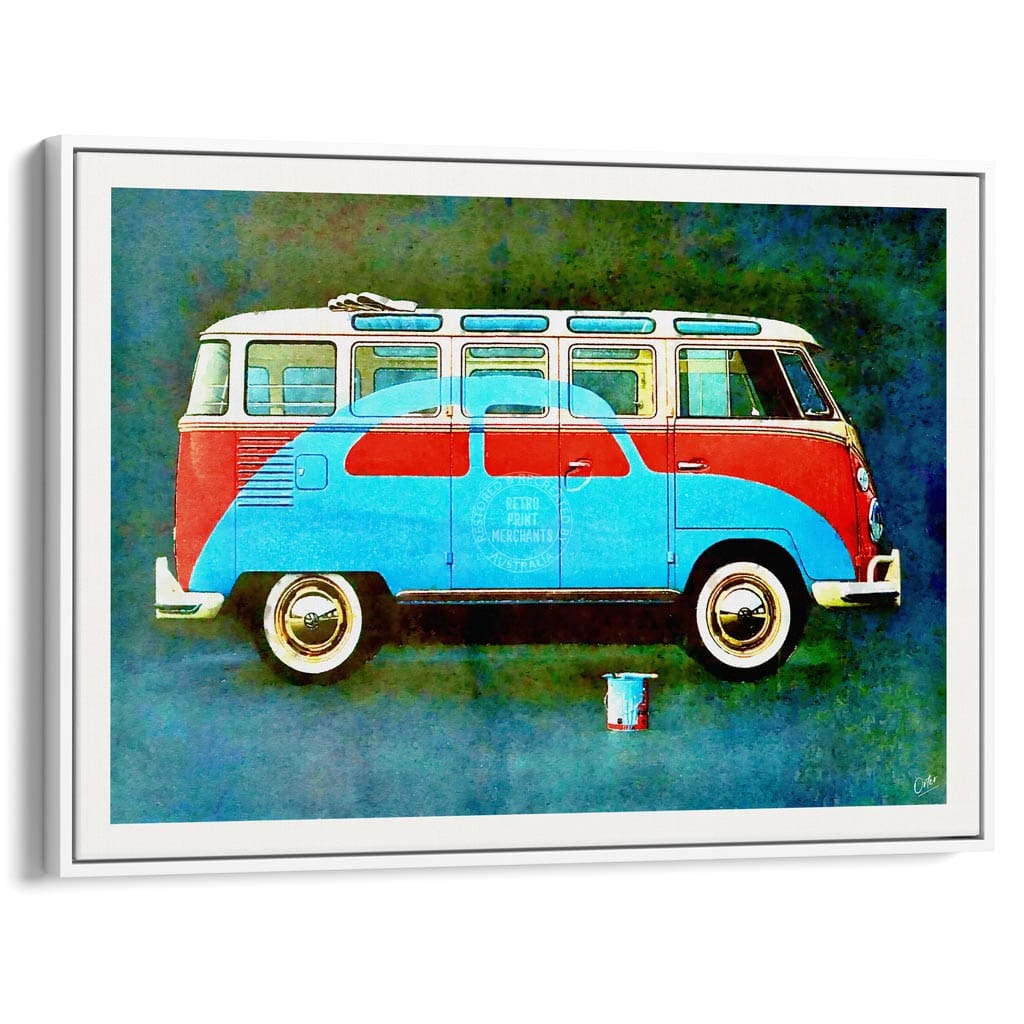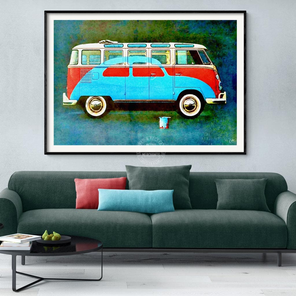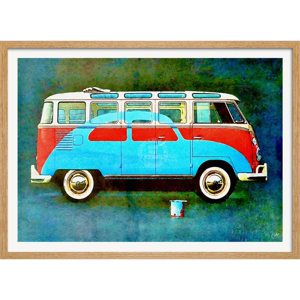 This watercolour Warhol-style pop art print of the iconic early 1960s VW Kombi is based on an image from an American Kombi advertisement of the time.